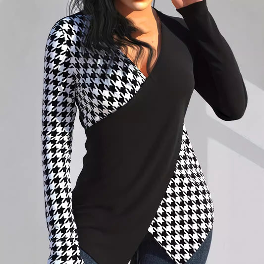 Women's Printed V-neck Stitching Long Sleeve T-shirt Top