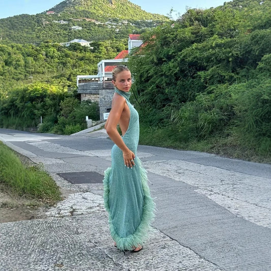 European And American Party Halter Dress Feather Stitching Vacation Style