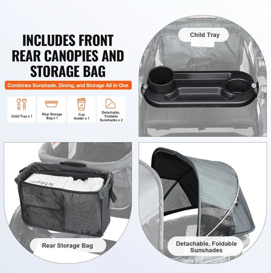 All-Terrain Stroller Wagon, 2 Seats Foldable Expedition 2-in-1 Collapsible Wagon Stroller, Includes Canopy, Parent Organizer, Snack Tray Cup Holders, 55lbs For Single Seat, Dark Grey Black