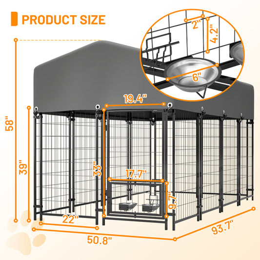 Dog Kennel Outdoor With Roof, 4.23'x7.81'x4.83' Welded Wire Enclosure, Heavy Duty Dog Crate With UV-Resistant Waterproof Cover, Double Lock & Rotating Feeder For Medium/Large Dogs