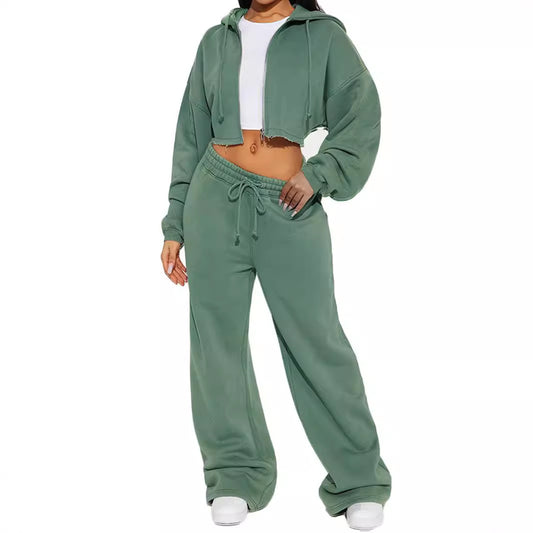 European And American Hooded Front Cardigan Zipper Sweater Wide Leg Loose Trousers Suit