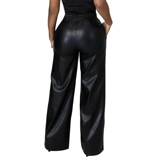 Women's Fashion Solid Color Loose Wide Leg Pocket PU Leather Pants
