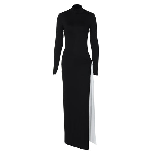High Collar Long Sleeve Sexy Slit Contrast Color Ribbon Black Dress