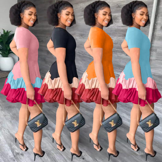 European And American Women's Clothing Summer Color Block Short Sleeve Pleated Dress