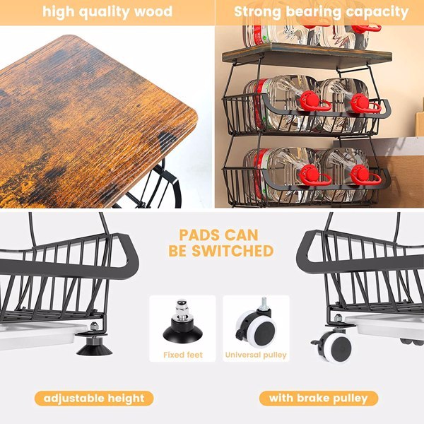 3. Easy to assemble - easy to install, each basket can be removed from the bracket when hanging, and can be stacked on top of each other with a buckle design. Kitchen baskets can be used separately or stacked one by one for convenient storage. The top is made of antique wooden boards with circular safety corners, thickened, waterproof, and detachable for easy cleaning.