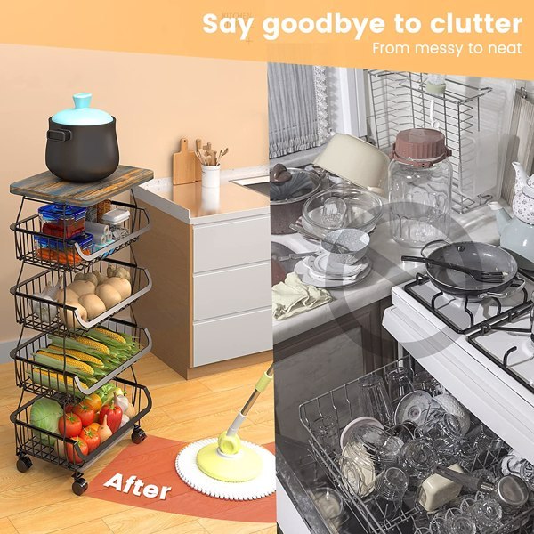1. Heavy duty Stackable Wire Basket - It is made of sturdy metal, rust resistant, and durable, making it perfect for storing everyday items. Each basket organizer is detachable and stackable. You can freely combine baskets to match the height of your cabinet. High quality wheels provide excellent load-bearing capacity. This kitchen wire vegetable rack has 4 rotating wheels (two with brakes) for easy transportation, and 4 adjustable feet.