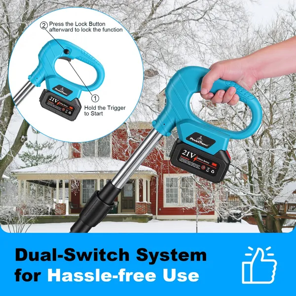 *Lightweight & Safe to Use*:Weighing only 7.17lbs,this power snow shovel is easy to carry with one hand—perfect for women and seniors. Start snow removal by pressing the trigger. Press the Lock Button afterward to lock the function,allowing for hands-free use. The battery features multiple protections including high-temperature shutoff,overload,and overcharge safety. Also includes 1 pair of gloves and protective goggles,ensuring both safety and convenience.