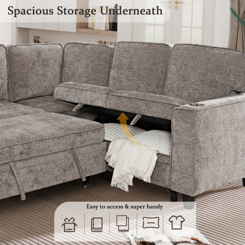 L-Shaped Sofa With Pull Out Sofa Bed, Sleeper Sofa Couch Bed With Storage Seat, 5 Seat Sectional Sofa Bed With USB, Sectional Sofa Couch For Living Room, Apartment