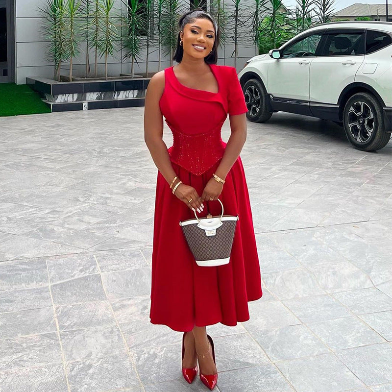 Ladies New Diagonal Collar Waist Seal Dress