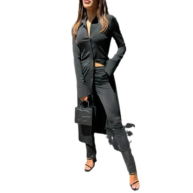 Ladies New Solid Color Polo Collar Button Long-sleeved Suit Pants