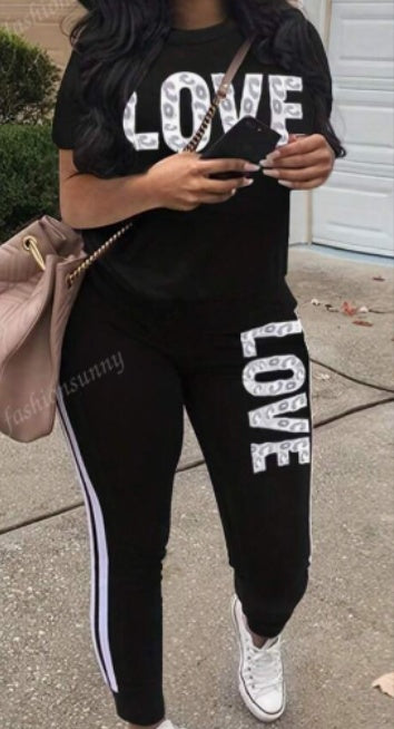 Letter Graphic Tee & Contrast Side Seam Sweatpants