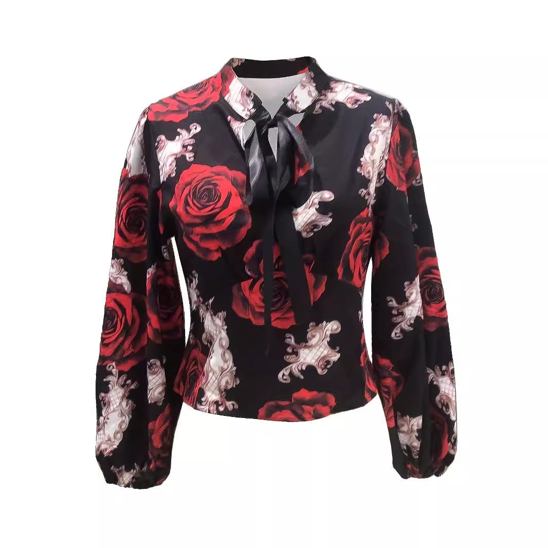 Long Sleeve V-neck Printed Streamer Lace Top
