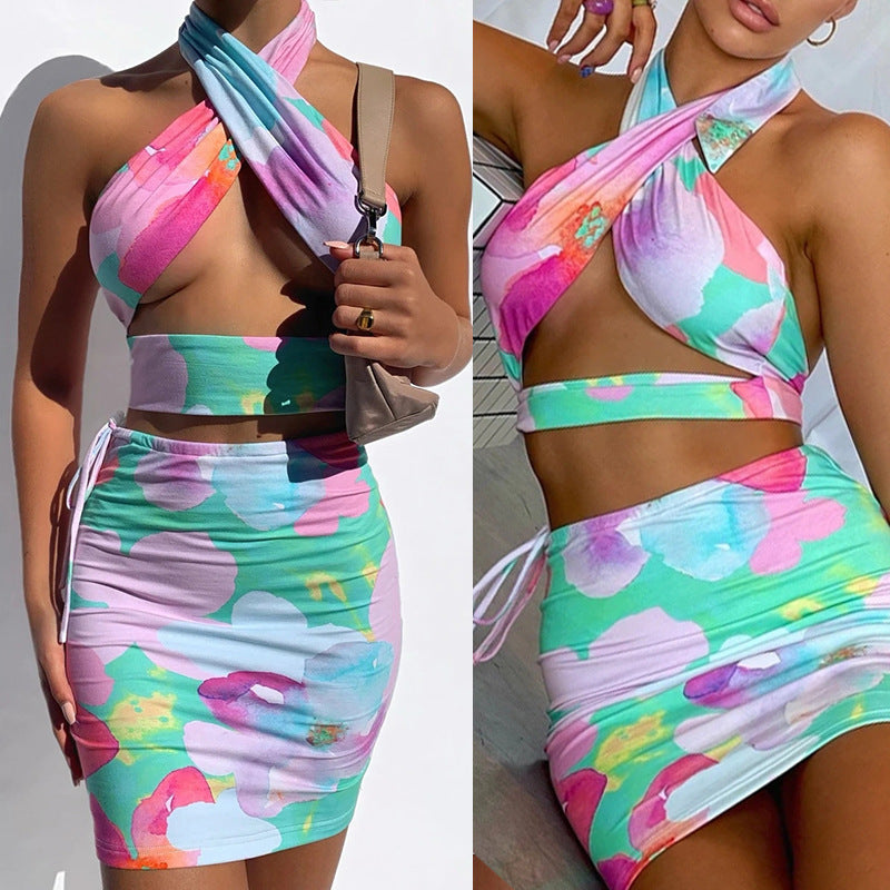 Printed Sexy Cross Halter Neck Bag Hip Casual Suit