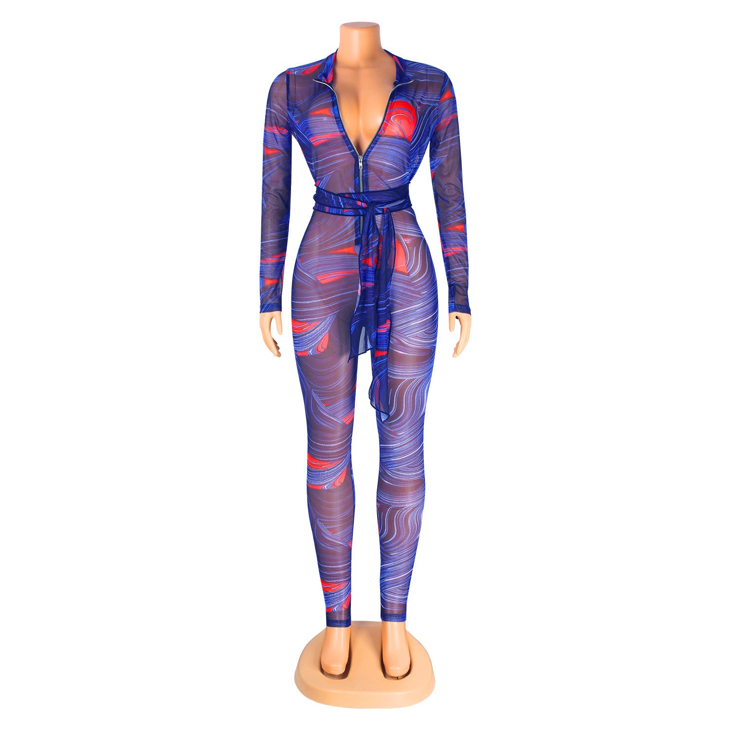 Printed Sexy Nightclub Long-Sleeved Mesh See-Through Jumpsuit