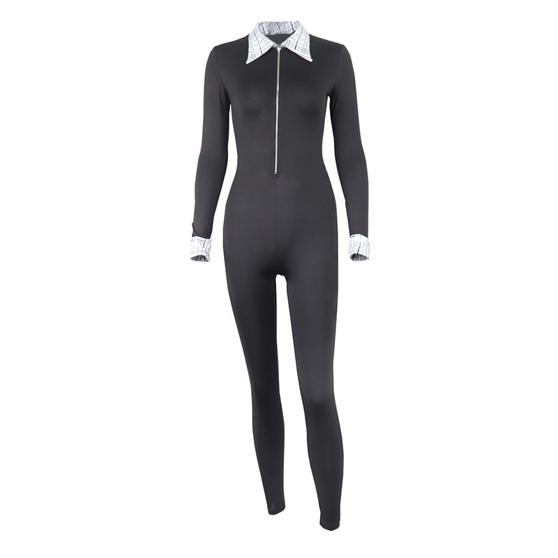 Solid Color Lapel Zip Tight Stretch Long Sleeve Yoga Dress Jumpsuit