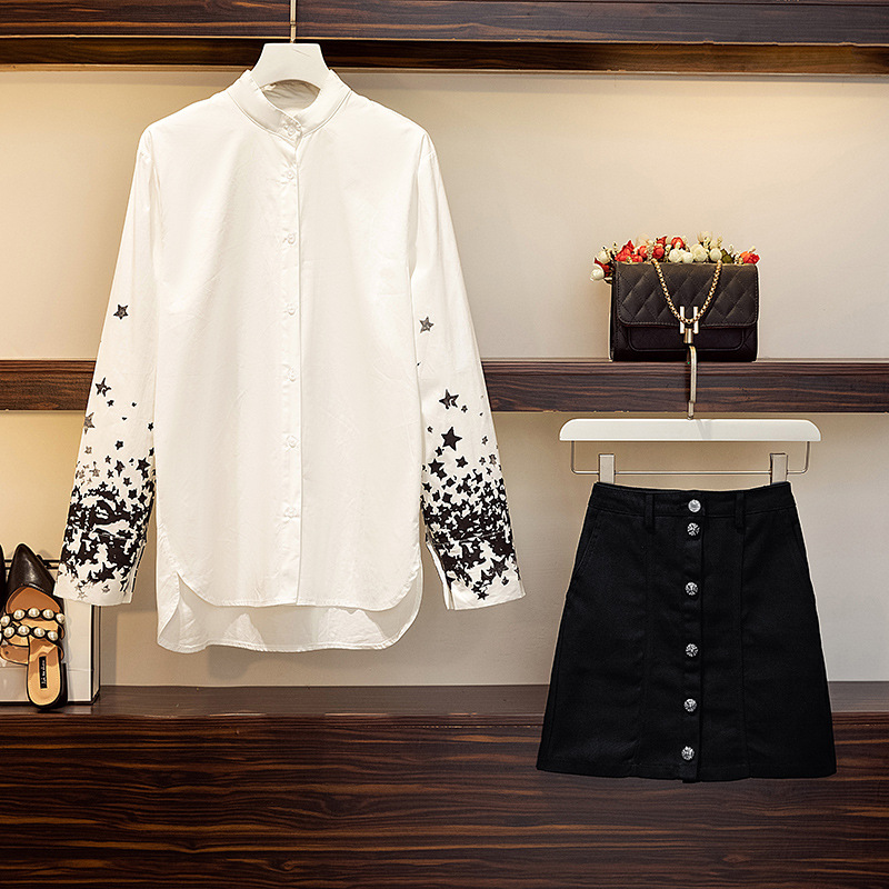 Two-piece suit with high waist and slim denim skirt