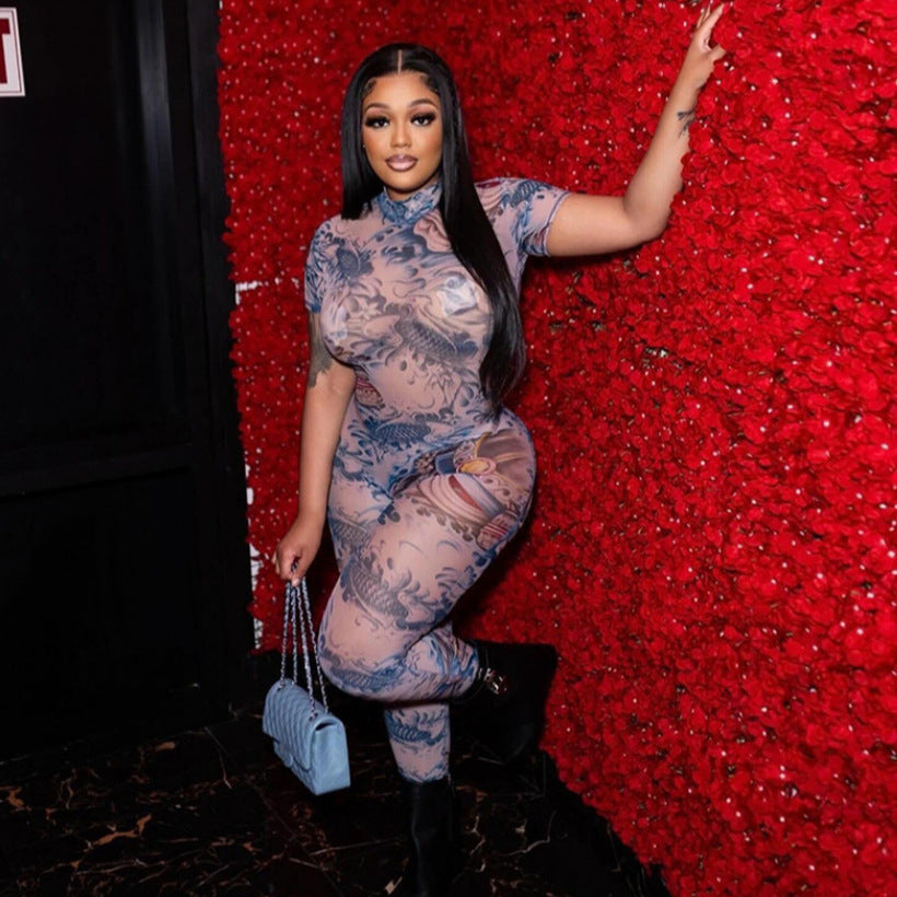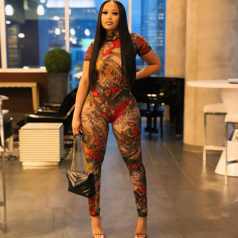 Women's Backless Fashion Printed Sheer Mesh Jumpsuit