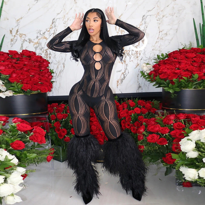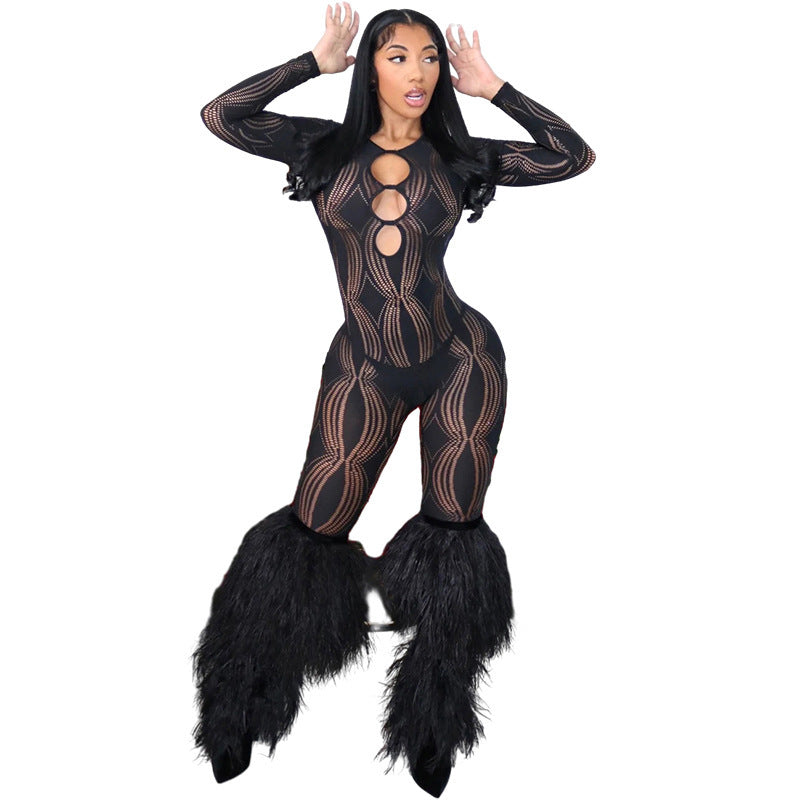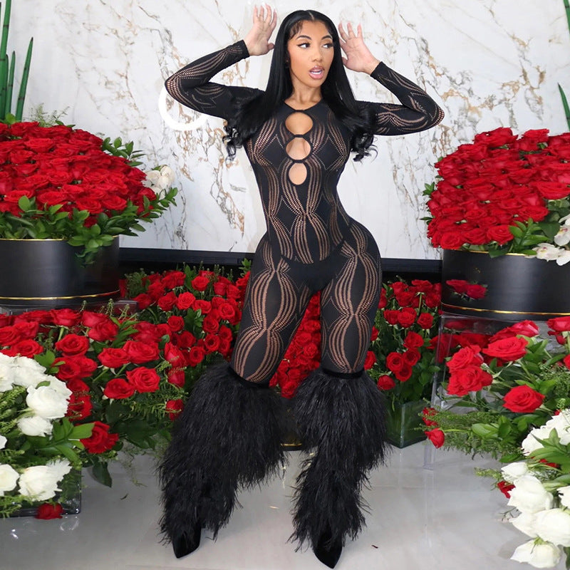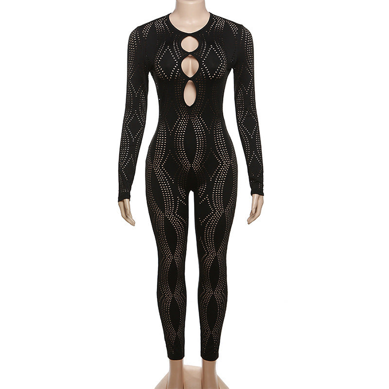 Women's Fashion Hollowed-out Ripped See-through High Waist Jumpsuit