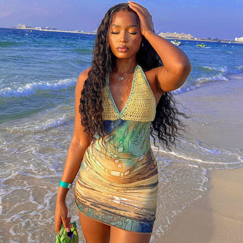 Women's Fashion Print Splicing Hanging Neck Package Hip Dress