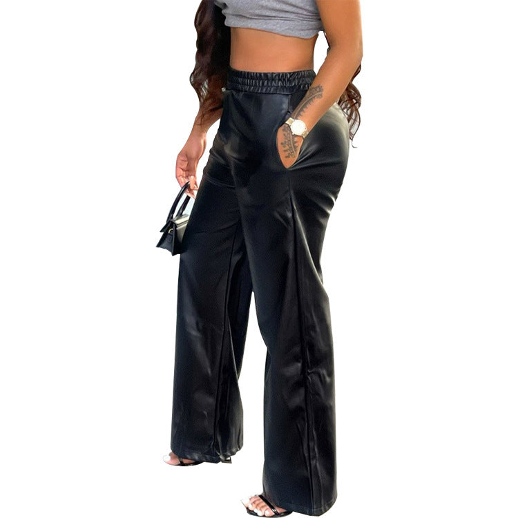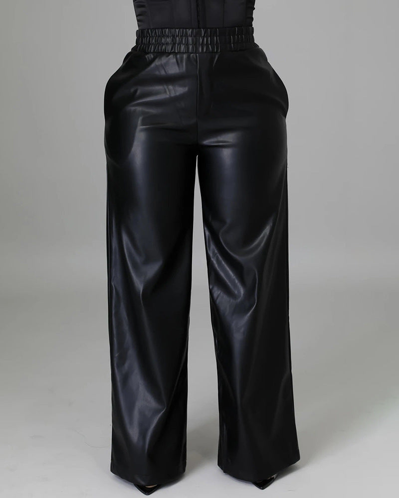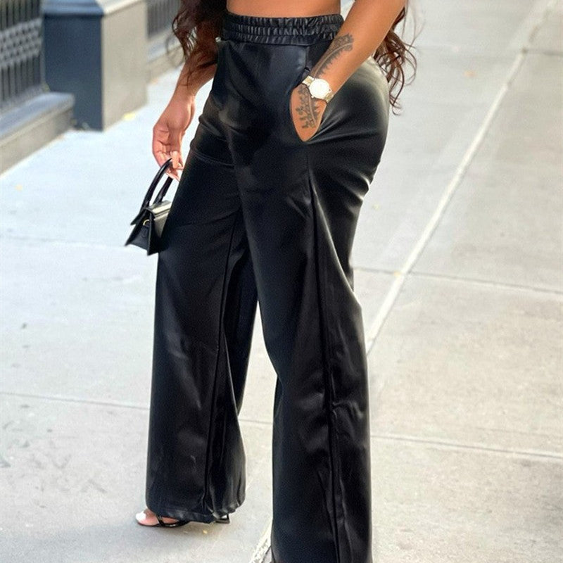 Women's Fashion Solid Color Loose Wide Leg Pocket PU Leather Pants